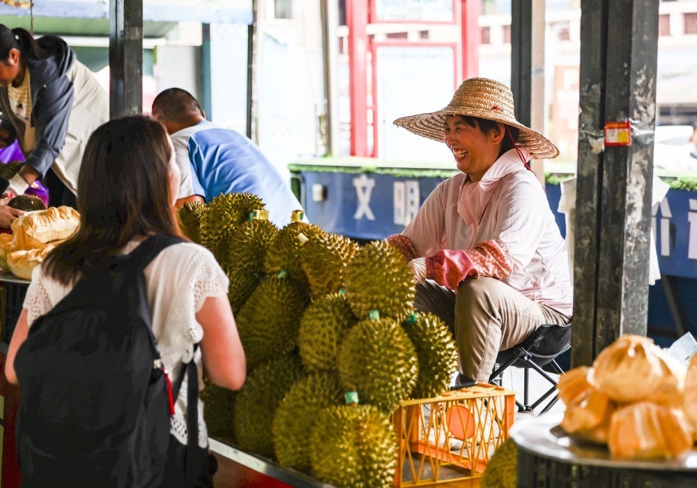2023年5月18日,越南果商在中國廣西東興售賣榴蓮。