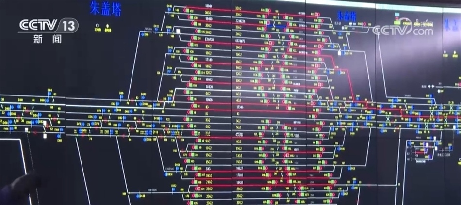 總臺(tái)央視記者 張叢婧:我現(xiàn)在是來到了車站的行車指揮室,可以看到這塊大屏幕上實(shí)時(shí)顯示著車站的列車狀態(tài),中間這些紅色的線就代表著此時(shí)軌道上正在有列車作業(yè)或者等待作業(yè),左邊這些紅色線就意味著現(xiàn)在有列車正在進(jìn)站。