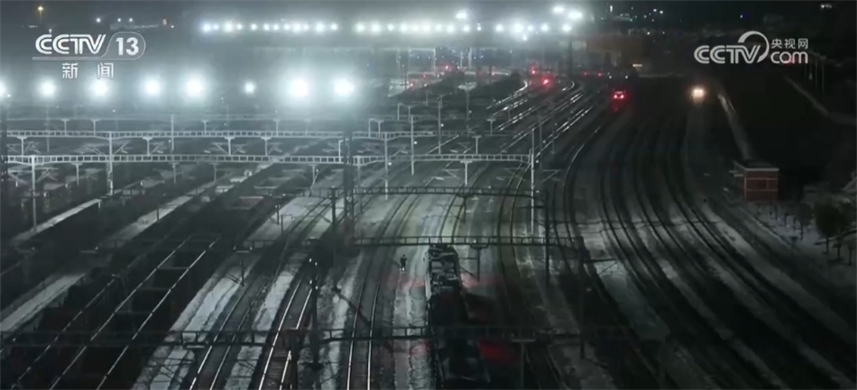 總臺(tái)央視記者 張叢婧:我這一下來,明顯感覺到冷了特別多,現(xiàn)在司機(jī)師傅就在這準(zhǔn)備做換車頭的工作。工作人員告訴我,在這個(gè)編組站里,現(xiàn)在幾乎每隔10分鐘就會(huì)有一列車編好組往外發(fā)出。我在車站里走了一會(huì),就感覺已經(jīng)要被凍透了,大家可以看一下,現(xiàn)在這里的溫度是有零下將近24攝氏度。