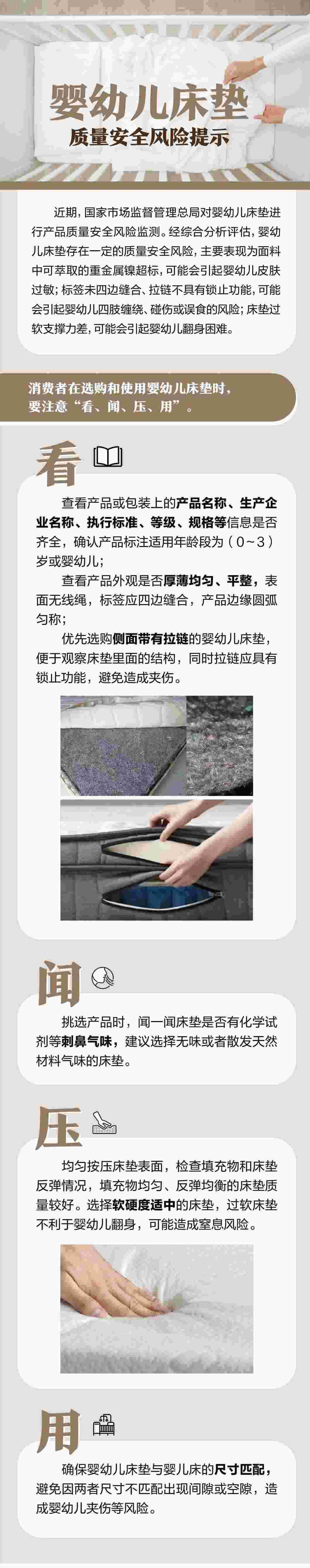 嬰幼兒床墊存在一定的質(zhì)量安全風(fēng)險(xiǎn),主要表現(xiàn)為面料中可萃取的重金屬鎳超標(biāo),可能會(huì)引起嬰幼兒皮膚過(guò)敏;標(biāo)簽未四邊縫合、拉鏈不具有鎖止功能,可能會(huì)引起嬰幼兒四肢纏繞、碰傷或誤食的風(fēng)險(xiǎn);床墊過(guò)軟支撐力差,可能會(huì)引起嬰幼兒翻身困難。