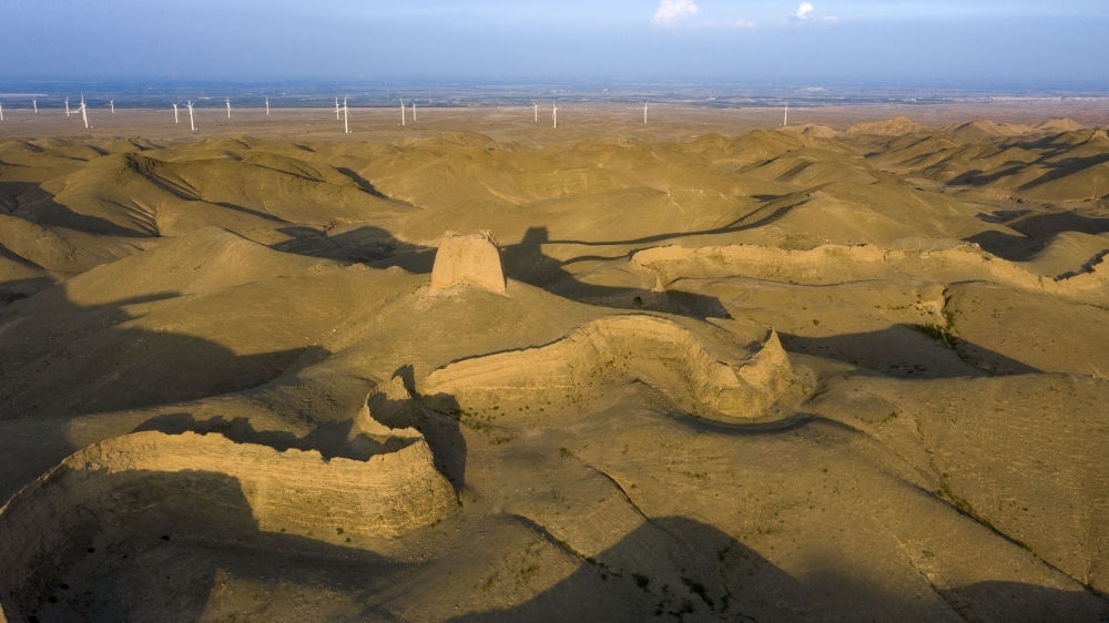 這是位于寧夏銀川市境內(nèi)的三關(guān)口土夯明長(zhǎng)城(無(wú)人機(jī)照片,2021年8月13日攝)。
