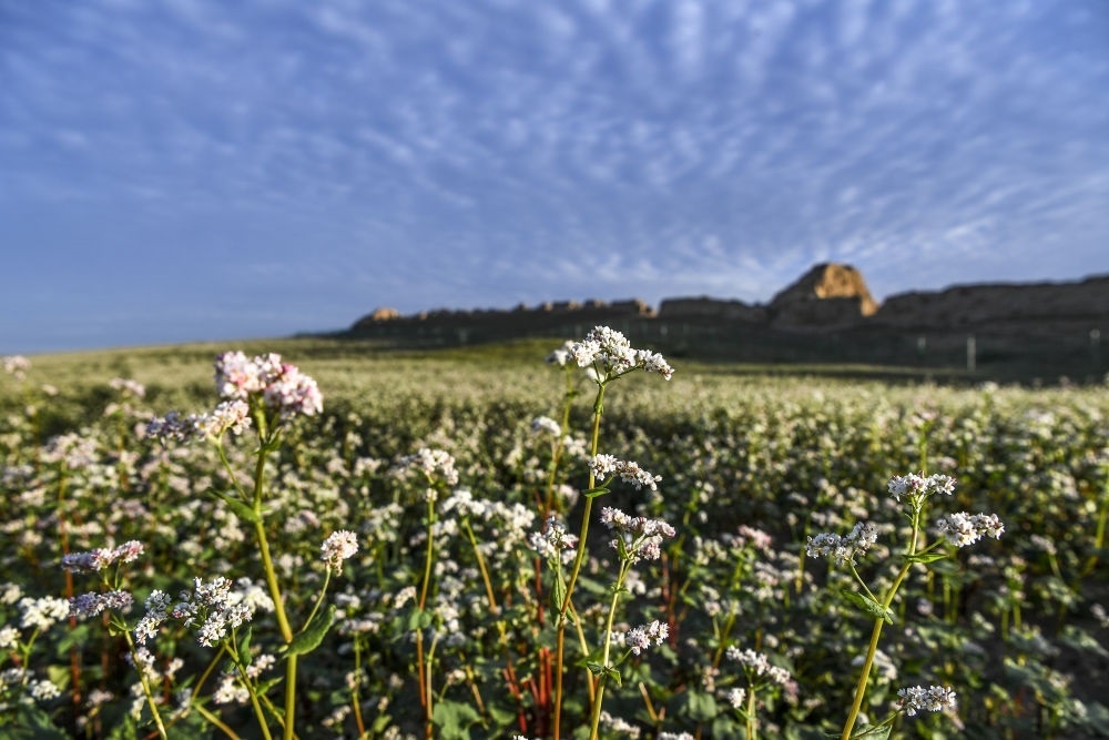 寧夏吳忠市鹽池縣一處長(zhǎng)城腳下蕎麥花開(kāi)放(2023年8月18日攝)。