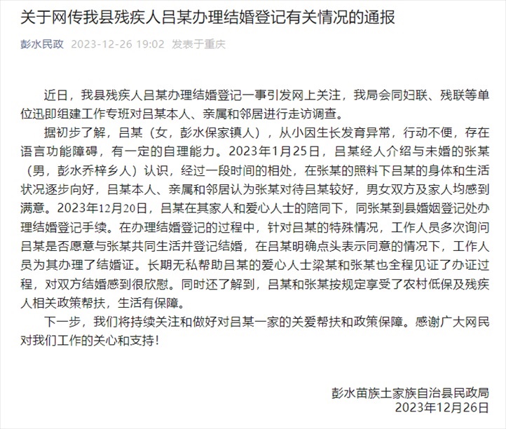 ·重慶彭水通報“23歲疑似智力障礙女子與五旬男子結(jié)婚”。