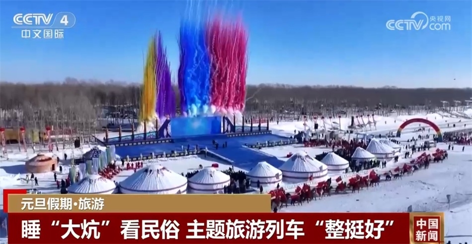 總臺(tái)央視記者 楊曜語:我即將登上的列車就是從哈爾濱開往漠河的國內(nèi)首個(gè)沉浸式東北民俗文化體驗(yàn)列車,坐過的人都說一上車就想盤腿兒了,我們趕緊來體驗(yàn)一下!一上車我就被濃濃的東北文化所感染到了,整個(gè)車廂都被東北大花的經(jīng)典配色裝飾著,再加上隨手就能品嘗到東北特色美食,坐在床鋪上就感覺一秒鐘“穿越”到農(nóng)家炕頭。