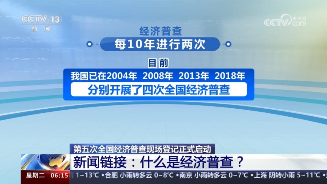 經(jīng)濟(jì)普查是一項(xiàng)重大的國情國力調(diào)查,與人口普查、農(nóng)業(yè)普查組成三大周期性全國普查項(xiàng)目。經(jīng)濟(jì)普查每10年進(jìn)行兩次,目前我國已在2004年、2008年、2013年和2018年分別開展了四次全國經(jīng)濟(jì)普查。