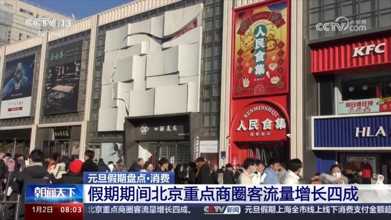 元旦假期期間,北京市商務(wù)局重點(diǎn)監(jiān)測的百貨、超市、專業(yè)專賣店、餐飲和電商等業(yè)態(tài)企業(yè)實(shí)現(xiàn)銷售額25.1億元,餐飲消費(fèi)增勢強(qiáng)勁,同比增長27.9%。北京全市60個重點(diǎn)商圈客流量2217.5萬人次,同比增長40.5%。