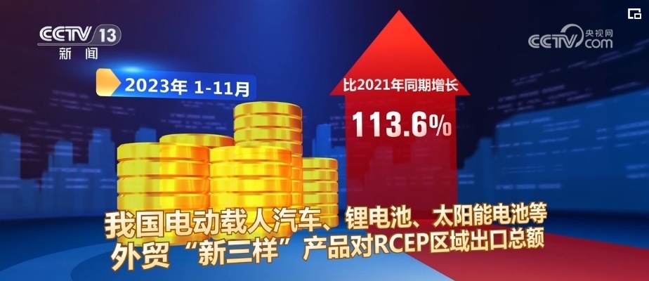 2023年1—11月,中國(guó)對(duì)RCEP成員國(guó)的中間品出口,比2021年同期增長(zhǎng)17.4%,中國(guó)成為區(qū)域內(nèi)最大的中間品貿(mào)易國(guó)。2023年1—11月,我國(guó)電動(dòng)載人汽車(chē)、鋰電池、太陽(yáng)能電池等外貿(mào)“新三樣”產(chǎn)品對(duì)RCEP區(qū)域出口總額,比2021年同期增長(zhǎng)113.6%。