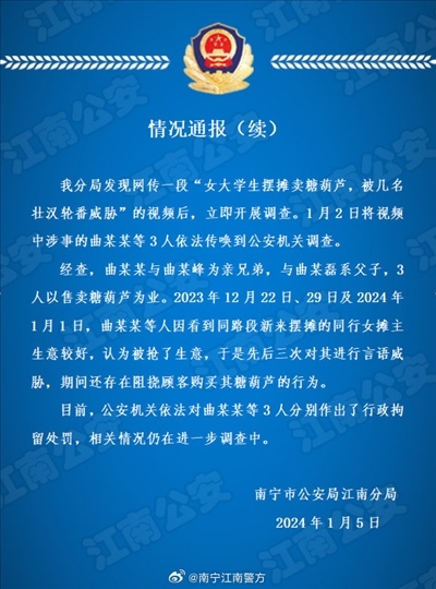 ·廣西南寧警方再通報(bào)“女大學(xué)生擺攤賣糖葫蘆被壯漢威脅”:3人被行拘。