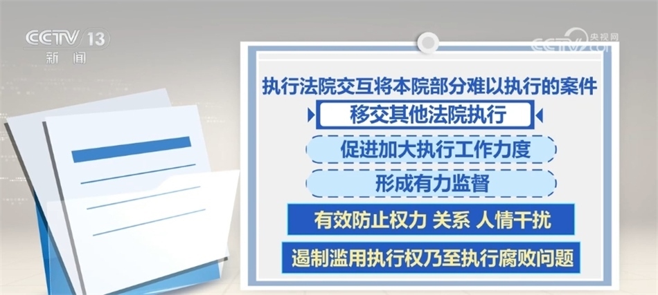 2023年10月,最高人民法院部署開展交叉執(zhí)行工作試點(diǎn)。據(jù)介紹,交叉執(zhí)行是指通過指定、提級執(zhí)行,執(zhí)行法院交互將本院部分難以執(zhí)行的案件移交其他法院執(zhí)行,促進(jìn)加大執(zhí)行工作力度,并形成有力監(jiān)督,有效防止權(quán)力、關(guān)系、人情干擾,遏制濫用執(zhí)行權(quán)乃至執(zhí)行腐敗問題。