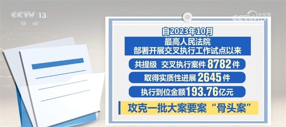 最高人民法院介紹,執(zhí)行難中常見被執(zhí)行人是當(dāng)?shù)刂匾髽I(yè)、納稅大戶,甚至是重點(diǎn)國企或行政部門等情況。交叉執(zhí)行就是要讓接受指定的法院在不受牽絆、沒有包袱、完全依法自主的條件下力推案件執(zhí)行。據(jù)統(tǒng)計(jì),開展交叉執(zhí)行工作試點(diǎn)以來,共提級、交叉執(zhí)行案件8782件,取得實(shí)質(zhì)性進(jìn)展2645件,執(zhí)行到位金額193.76億元,攻克了一批大案要案“骨頭案”。最高人民法院要求,上級法院發(fā)現(xiàn)原執(zhí)行法院存在消極執(zhí)行、拖延執(zhí)行等執(zhí)行不力情形,發(fā)現(xiàn)違紀(jì)違法問題線索的,應(yīng)當(dāng)嚴(yán)肅依紀(jì)依法查處、追究責(zé)任。