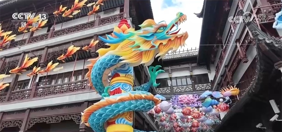 這幾天,南京路上各種龍元素裝置和商品將步行街裝飾一新;在南京西路商圈,這個造型裝置宛若一只巨龍騰空而起,頗有氣勢;在上海徐家匯、中山公園、前灘等商圈,各色龍元素燈組亮相;在龍華商圈,戲臺也演繹出龍的造型,大街小巷春節(jié)氛圍滿滿。