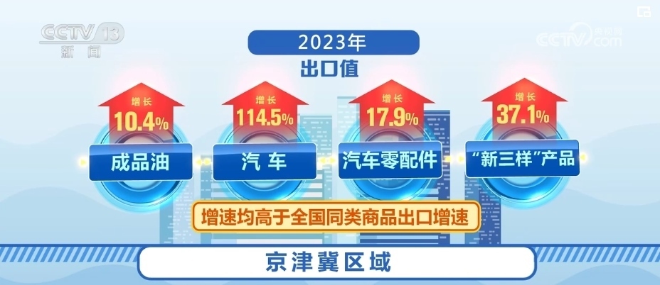 出口方面,2023年京津冀區(qū)域出口1.31萬(wàn)億元,增長(zhǎng)2.5%,占全國(guó)出口總值的5.5%。其中,成品油、汽車(chē)、汽車(chē)零配件、“新三樣”產(chǎn)品出口值分別增長(zhǎng)10.4%、114.5%、17.9%、37.1%,增速均高于全國(guó)同類(lèi)商品出口增速。成品油出口量、出口值占全國(guó)成品油出口總量、出口總值的一半以上。