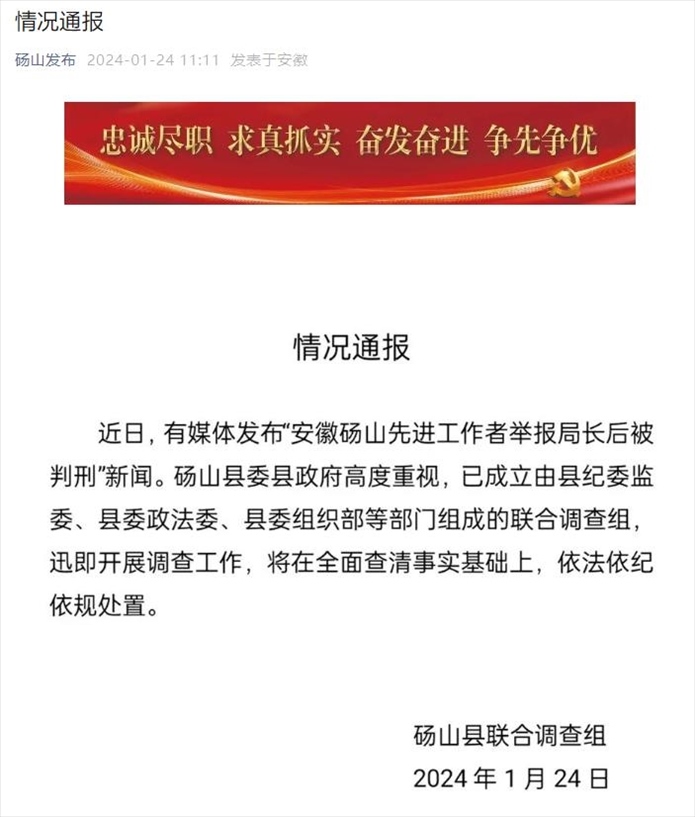 ·安徽碭山先進(jìn)工作者舉報(bào)局長(zhǎng)后被判刑?碭山縣回應(yīng):已成立聯(lián)合調(diào)查組迅即開展調(diào)查工作,將在全面查清事實(shí)基礎(chǔ)上,依法依紀(jì)依規(guī)處置。