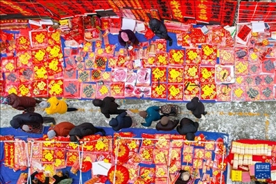 春節(jié)臨近,各地張燈結(jié)彩。人們逛花市、賞花燈、置辦年貨,年味漸濃。這是無人機(jī)拍攝的1月22日山東省青島市李村大集,人們?cè)谶x購(gòu)春節(jié)飾品。