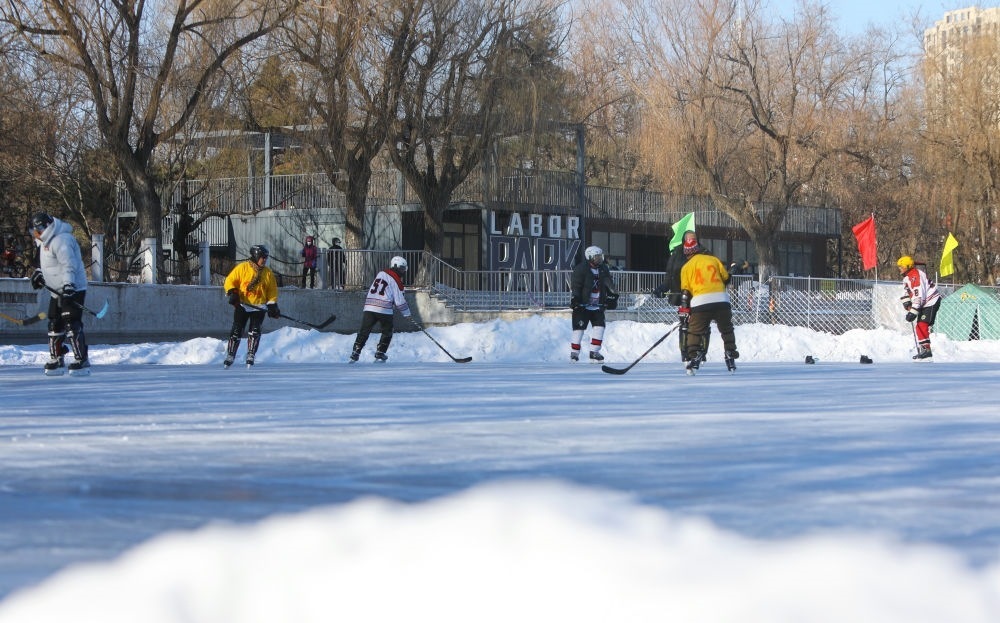 ?2024年1月7日,冰球愛好者在遼寧省沈陽市勞動(dòng)公園人工湖上打冰球。新華社記者 陳為 攝