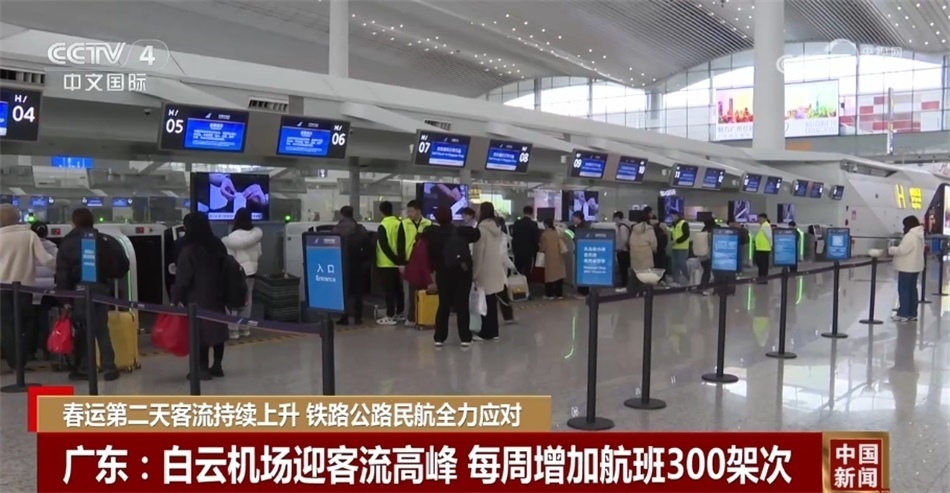 廣東廣州白云國際機(jī)場1月26日起迎來客流高峰,為保障客流增長需求,白云機(jī)場及航司每周增加航班300架次。據(jù)預(yù)測,今年春運(yùn)期間白云機(jī)場計劃起降航班超6萬架次,預(yù)計接送旅客超910萬人次,最高單日客流預(yù)計將達(dá)26萬人次,貨郵吞吐量預(yù)計超20萬噸。????