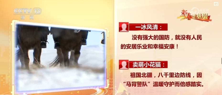 《新春走基層·馬背警隊(duì):風(fēng)雪中的溫暖守護(hù)》播出后,有網(wǎng)友說:“沒有強(qiáng)大的國防,就沒有人民的安居樂業(yè)和幸福安康!”。也有網(wǎng)友說:“祖國北疆,八千里邊防線,因“馬背警隊(duì)”溫暖守護(hù)而倍感踏實(shí)?!?br>
