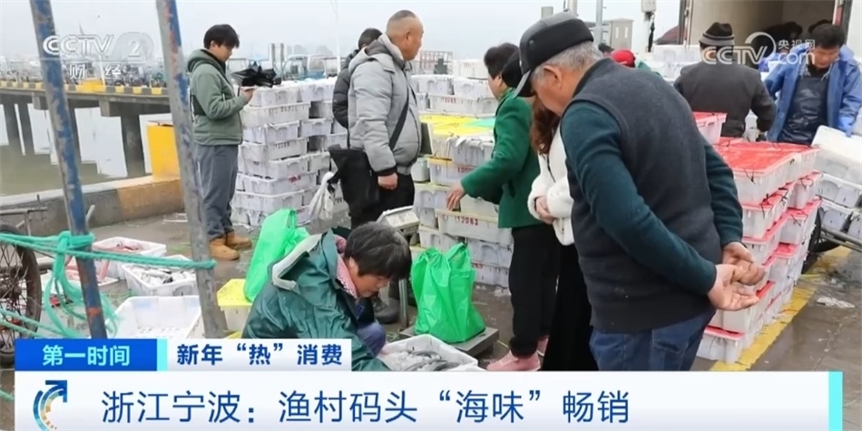 浙江寧波奉化區(qū)莼湖街道的漁村碼頭也進入了年前最后的繁忙時刻。上午八點,5艘運輸船停靠在內(nèi)外碼頭上,據(jù)了解,一艘運輸船有七八千箱漁獲物,近八成是帶魚。最近每天有百萬斤東海魚貨就地銷售或運往全國各地,預(yù)計將持續(xù)至臘月二十七。在碼頭邊桐照魚市場的攤位上,色澤鮮亮的帶魚、鯧魚、大黃魚等海產(chǎn)品琳瑯滿目,市民們忙著挑選,漁商們則賣力吆喝著。