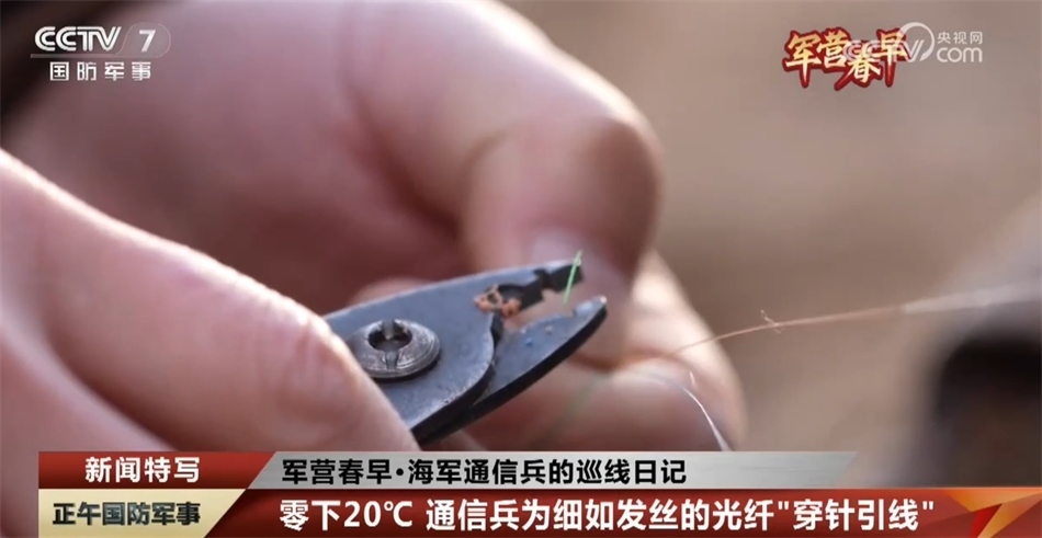 海軍某總站 鄭乾:因?yàn)楣饫w是玻璃材質(zhì)的,冬天特別寒冷,就會(huì)導(dǎo)致光纖特別容易斷裂,特別是在光纖切割刀切割光纖的時(shí)候,一不小心就會(huì)砸斷,有可能出現(xiàn)強(qiáng)行熔接的情況,一旦出現(xiàn)這種情況,任務(wù)就(可能)因?yàn)椋〝?shù)據(jù))無(wú)法使用,任務(wù)就會(huì)無(wú)法開(kāi)展、失敗了。