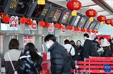 1月30日,人們?cè)诤诤铀\(yùn)口岸出境大廳等候進(jìn)入出境通道。新華社記者 謝劍飛 攝