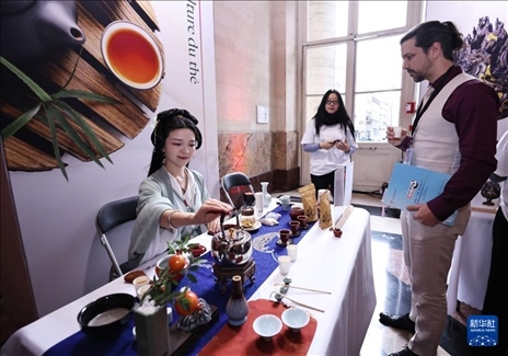 1月30日,在法國(guó)巴黎布龍尼亞宮舉行的“你好!中國(guó)”旅游推介會(huì)上,嘉賓體驗(yàn)中國(guó)茶。新華社記者 高靜 攝