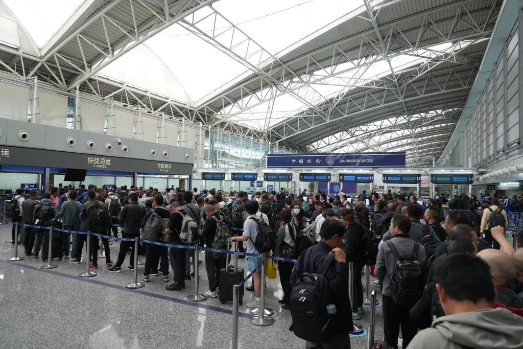 1月17日,廣州白云機(jī)場(chǎng)口岸T1航站樓入境大廳人頭攢動(dòng)。(白云邊檢站供圖)