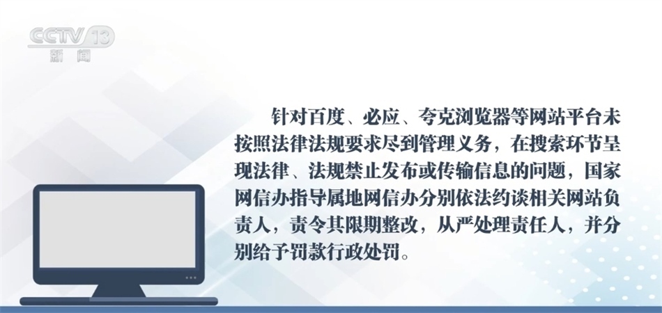 針對(duì)百度、必應(yīng)、夸克瀏覽器等網(wǎng)站平臺(tái)未按照法律法規(guī)要求盡到管理義務(wù),在搜索環(huán)節(jié)呈現(xiàn)法律、法規(guī)禁止發(fā)布或傳輸?shù)男畔?wèn)題,國(guó)家網(wǎng)信辦指導(dǎo)屬地網(wǎng)信辦分別依法約談相關(guān)網(wǎng)站負(fù)責(zé)人,責(zé)令其限期整改,從嚴(yán)處理責(zé)任人,并分別給予罰款行政處罰。