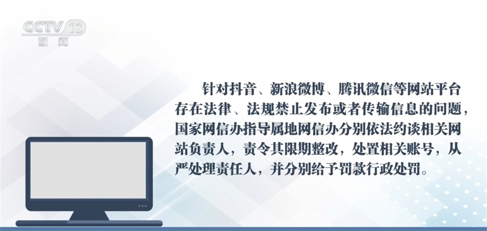 針對(duì)抖音、新浪微博、騰訊微信等網(wǎng)站平臺(tái)存在法律、法規(guī)禁止發(fā)布或者傳輸信息的問(wèn)題,國(guó)家網(wǎng)信辦指導(dǎo)屬地網(wǎng)信辦分別依法約談相關(guān)網(wǎng)站負(fù)責(zé)人,責(zé)令其限期整改,處置相關(guān)賬號(hào),從嚴(yán)處理責(zé)任人,并分別給予罰款行政處罰。