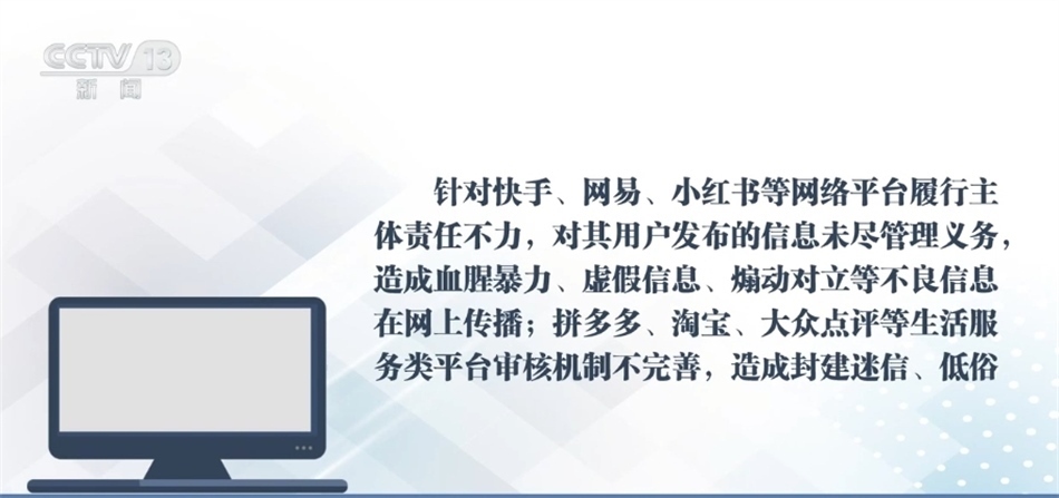 針對(duì)快手、網(wǎng)易、小紅書等網(wǎng)絡(luò)平臺(tái)履行主體責(zé)任不力,對(duì)其用戶發(fā)布的信息未盡管理義務(wù),造成血腥暴力、虛假信息、煽動(dòng)對(duì)立等不良信息在網(wǎng)上傳播;拼多多、淘寶、大眾點(diǎn)評(píng)等生活服務(wù)類平臺(tái)審核機(jī)制不完善,造成封建迷信、低俗色情信息在網(wǎng)上傳播等問(wèn)題,國(guó)家網(wǎng)信辦指導(dǎo)屬地網(wǎng)信辦分別依法約談相關(guān)網(wǎng)站負(fù)責(zé)人,責(zé)令其限期整改,處置相關(guān)賬號(hào),從嚴(yán)處理責(zé)任人,并分別給予警告、罰款等行政處罰。