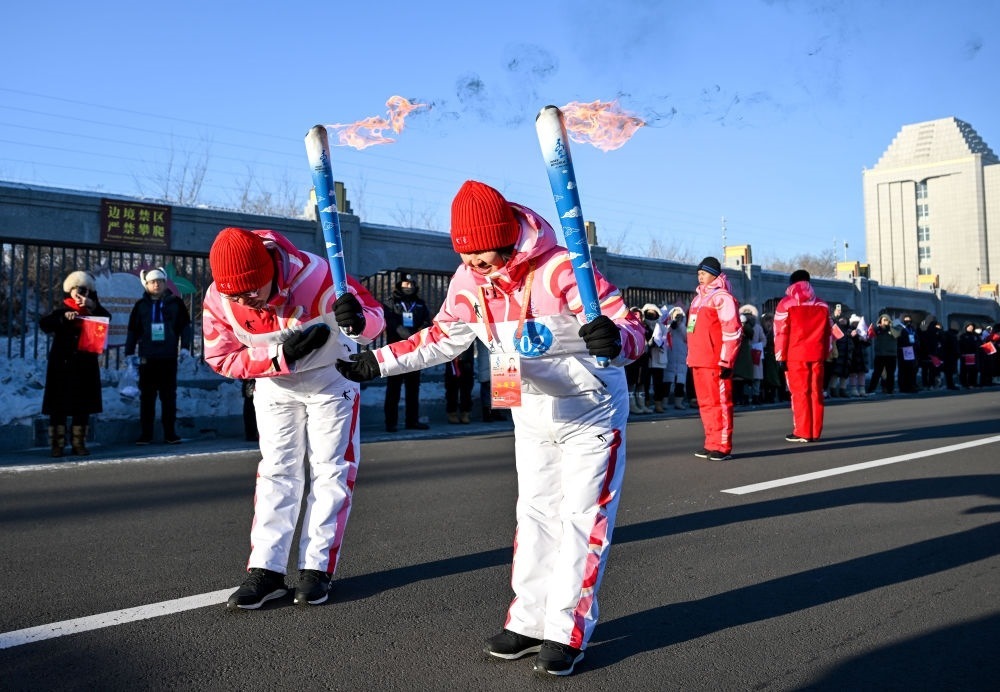 ??2月3日,在內(nèi)蒙古呼倫貝爾市滿洲里國門景區(qū),火炬手包玲玲(右)和錢卓在火炬?zhèn)鬟f活動(dòng)中。新華社記者 連振 攝