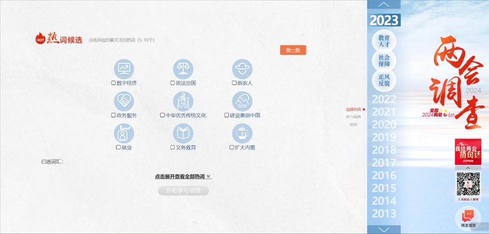 人民網(wǎng)北京2月5日電 (記者 黃子娟)人民網(wǎng)2024年全國兩會調(diào)查于今日正式上線,這是人民網(wǎng)連續(xù)23年開展全國兩會調(diào)查。網(wǎng)友可通過人民網(wǎng)2024年全國兩會調(diào)查專題、“人民網(wǎng)+”客戶端、人民網(wǎng)法人微博、人民網(wǎng)官方微信、“學(xué)習(xí)大國”微信公眾號等全媒體通道進(jìn)入調(diào)查頁面,選擇您最關(guān)心的熱詞并填寫調(diào)查問卷。