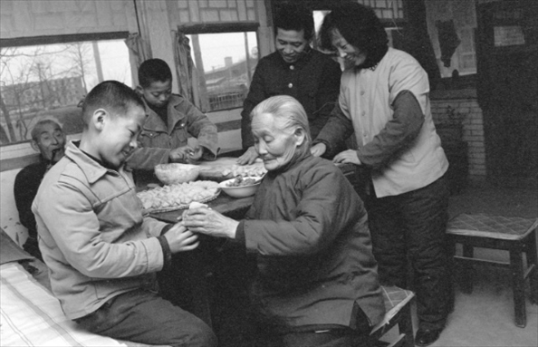 1985年,山東牟平一戶農(nóng)民全家一起包餃子。