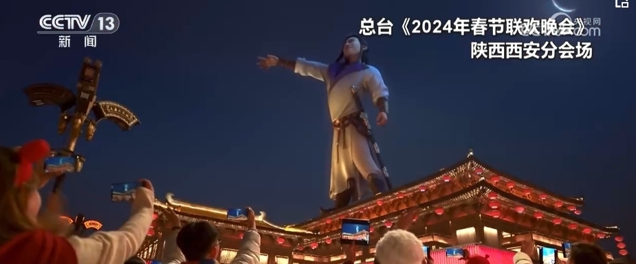 除夕當(dāng)晚9時,西安分會場《山河詩長安》篇章的“打開方式”讓人眼前一亮。在科技助力下,“詩仙”李白跨越歲月長河“穿越”而來,在煙火璀璨中,隨著熙熙攘攘的人群一起走進西安城墻永寧門,走入千年后的耀眼長安。