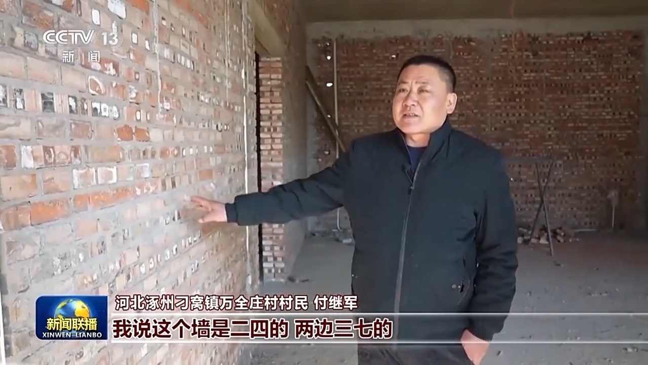 河北涿州刁窩鎮(zhèn)萬全莊村村民 付繼軍:去年,總書記來那會兒這個房子剛壘墻壘到這個位置,總書記還這么摸了摸,說這活兒干得挺好,問了問我這是三七墻呀二四墻呀,我說這個墻是二四的,兩邊三七的,看著總書記特別溫暖,那會兒真是掉眼淚。準(zhǔn)備抓緊裝修,盡快搬進(jìn)來,村里邊現(xiàn)在大家也都干勁挺大的,盡最大努力,把日子過好。