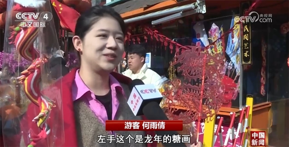 游客何雨倩在接受記者采訪時(shí)說(shuō):“逛廟會(huì),過(guò)大年,今天最大的驚喜就是看到了這么多的非遺項(xiàng)目,我右手這個(gè)是龍年的生肖面人,左手這個(gè)是龍年的糖畫(huà),特別適合打卡,真是太有年味了?!?/p>