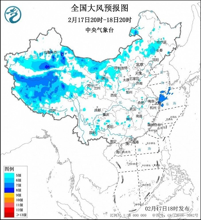 2月18日20時至19日20時,西藏中西部、青海南部、甘肅河西、內(nèi)蒙古西部和中部、遼寧西部和南部等地將有5~6級、陣風(fēng)7~9級的大風(fēng);渤海、渤海海峽、黃海大部海域、東海北部海域?qū)⒂?~8級、陣風(fēng)9~10級的大風(fēng)。