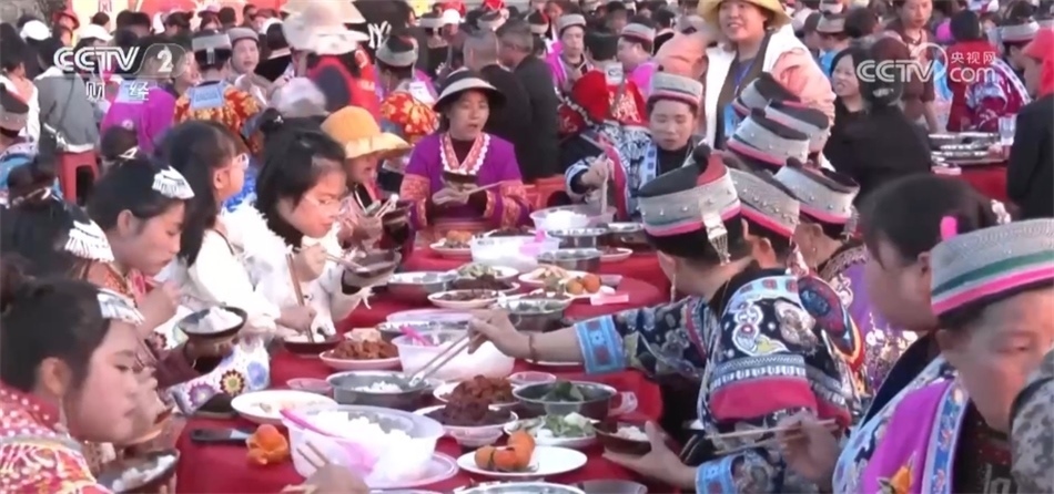 隨后,三合苗寨圍繞著“花樹”擺起長桌宴,苗族同胞和游客們一起喝起水花酒、跳起蘆笙舞,一起歡慶新春到來。今年春節(jié)期間,安順各地將舉行上百場苗族跳花活動(dòng)。