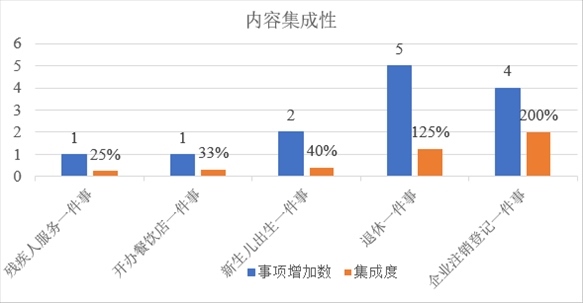 從內(nèi)容集成度看,5項(xiàng)相關(guān)“一件事”的事項(xiàng)集成比例均有不同程度提升。“殘疾人服務(wù)一件事”增加1個(gè)事項(xiàng),集成度提升25%?!伴_辦餐飲店一件事”增加1個(gè)事項(xiàng),集成度提升33%?!靶律鷥撼錾患隆痹黾?個(gè)事項(xiàng),集成度提升40%?!巴诵菀患隆痹黾?個(gè)事項(xiàng),集成度提升125%?!捌髽I(yè)注銷登記一件事”增加4個(gè)事項(xiàng),集成度提升200%。