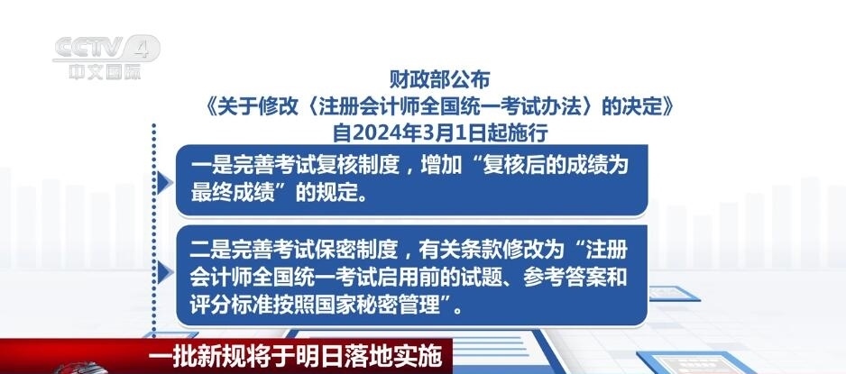 財(cái)政部公布《關(guān)于修改〈注冊(cè)會(huì)計(jì)師全國統(tǒng)一考試辦法〉的決定》,自2024年3月1日起施行。《決定》共修改2條。一是完善考試復(fù)核制度,增加“復(fù)核后的成績?yōu)樽罱K成績”的規(guī)定。二是完善考試保密制度,有關(guān)條款修改為“注冊(cè)會(huì)計(jì)師全國統(tǒng)一考試啟用前的試題、參考答案和評(píng)分標(biāo)準(zhǔn)按照國家秘密管理”。