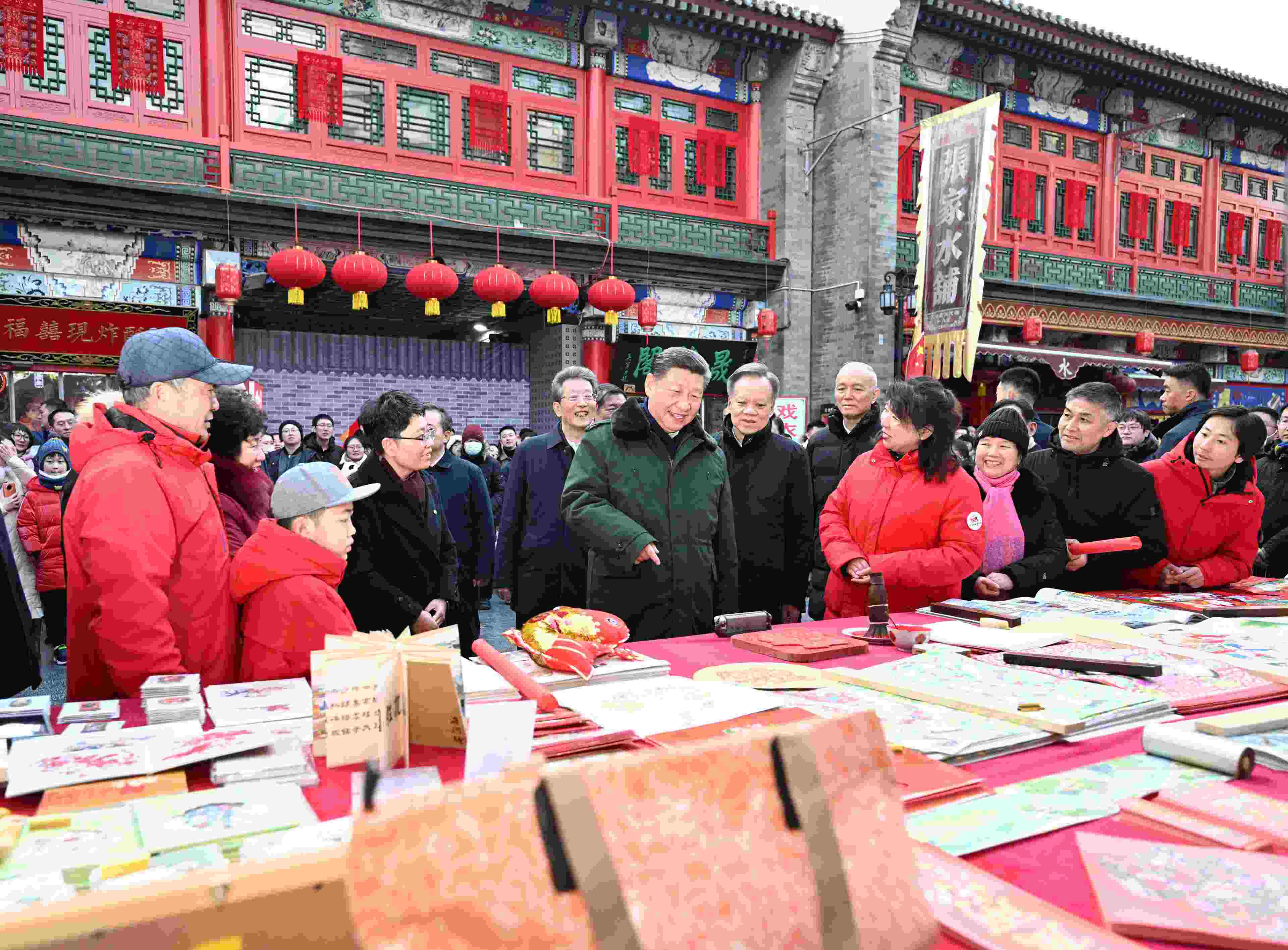 2月1日下午,總書記出現(xiàn)在了素有“津門故里”之稱的天津古文化街。在這個天津最早的經(jīng)濟(jì)、文化、商貿(mào)聚集地,總書記考察了歷史悠久的桂發(fā)祥十八街麻花、果仁張、泥人張、楊柳青年畫等“老字號”店鋪,向小朋友贈送麻花和栗子羹等天津特色傳統(tǒng)小吃,與群眾一起欣賞喜氣騰騰的“津味中國年”表演,看政通人和,品文脈傳承,溫故而知新。