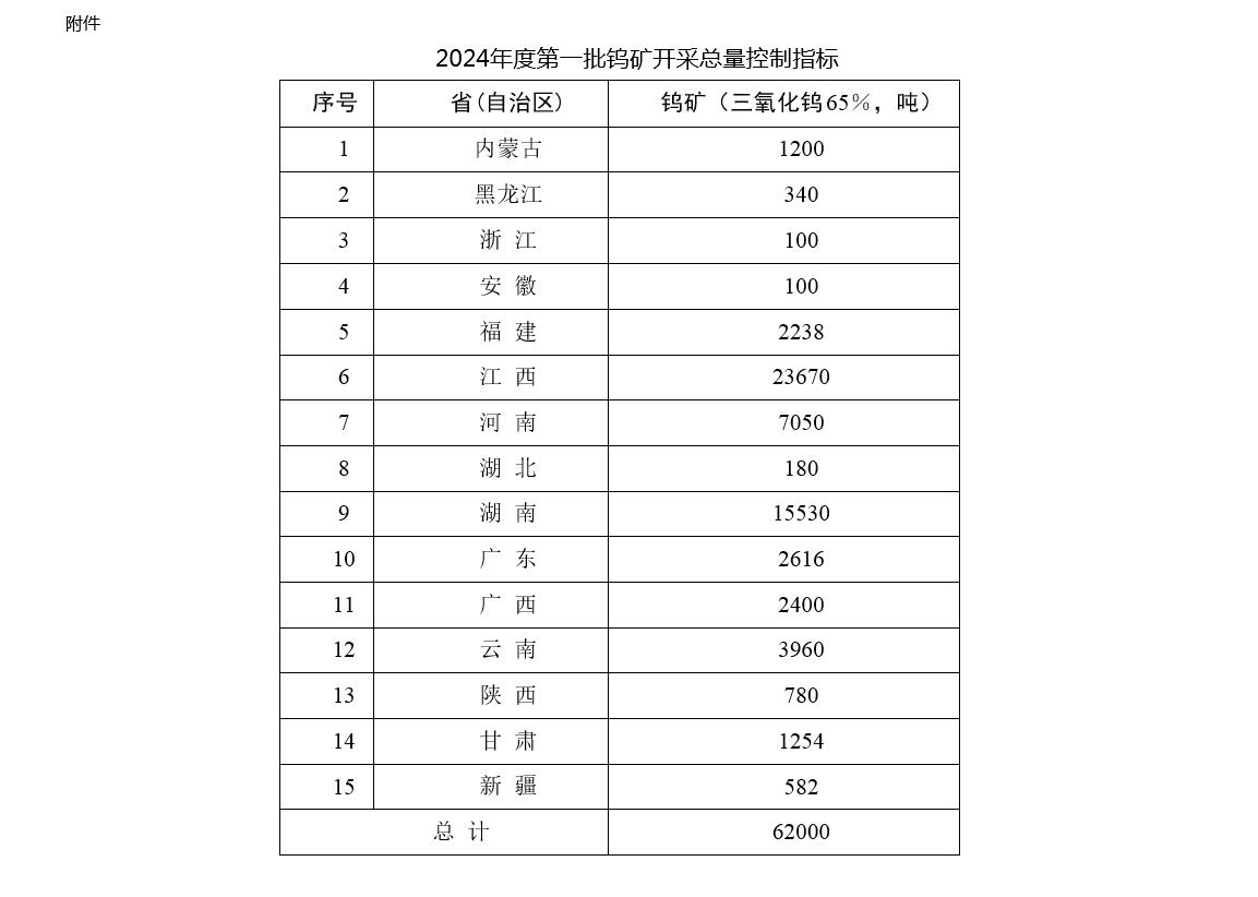 央視網(wǎng)消息:據(jù)自然資源部消息,自然資源部發(fā)布關(guān)于下達(dá)2024年度鎢礦開(kāi)采總量控制指標(biāo)(第一批)的通知,2024年度第一批鎢礦(三氧化鎢含量65%,下同)開(kāi)采總量控制指標(biāo)62000噸。鎢礦開(kāi)采總量控制指標(biāo)不再區(qū)分主采指標(biāo)和綜合利用指標(biāo)。對(duì)采礦許可證登記開(kāi)采主礦種為其他礦種、共伴生鎢礦的礦山,查明鎢資源量為大中型的,繼續(xù)下達(dá)開(kāi)采總量控制指標(biāo),并在分配上予以傾斜。對(duì)共伴生鎢資源量為小型的,不再下達(dá)開(kāi)采總量控制指標(biāo),由礦山企業(yè)向所在地省級(jí)自然資源主管部門報(bào)備鎢礦產(chǎn)量。具體如下:
