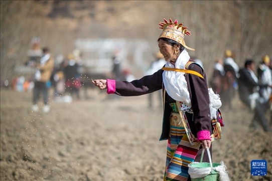 3月16日,在西藏山南市瓊結縣加麻鄉(xiāng)加麻村的春耕儀式現場,農民播撒種子。新華社記者 旦增尼瑪曲珠 攝