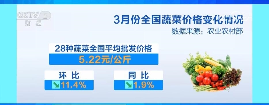 3月份,農業(yè)農村部監(jiān)測的28種蔬菜全國平均批發(fā)價格為每公斤5.22元,環(huán)比下降11.4%,同比下降1.9%。分品種看,23種蔬菜價格環(huán)比下降,5種上漲,其中降幅較大的品種有菠菜、黃瓜、生菜和青椒。