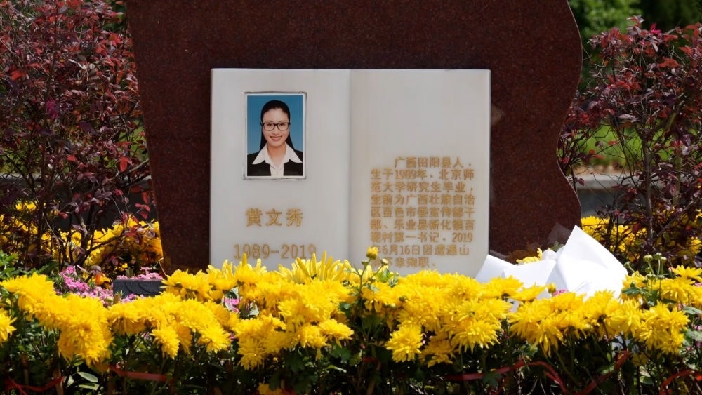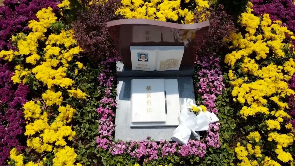 黃文秀墓前擺放著《扶貧日記》雕塑