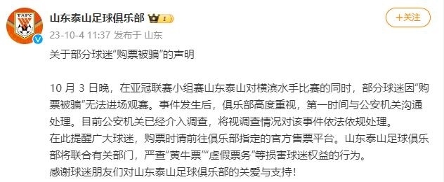 山東泰山足球俱樂(lè)部回應(yīng)部分球迷“購(gòu)票被騙”:公安已介入調(diào)查 在此提醒廣大球迷,購(gòu)票時(shí)請(qǐng)前往俱樂(lè)部指定的官方售票......