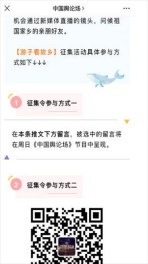 “早安中國(guó)切口新穎,有文化屬性和微記錄的氣質(zhì)。”“每次片尾的結(jié)語(yǔ)字幕,都是從哪里選的?每天,都給我學(xué)習(xí)的機(jī)會(huì)?!薄皩I(yè)微記錄是媒體融合最寬廣的路?!薄对绨仓袊?guó)》真真切切地緩解了許多海內(nèi)外網(wǎng)友的故土思鄉(xiāng)情切,也收到了來(lái)自四面八方的認(rèn)可及反饋?!吨袊?guó)輿論場(chǎng)》節(jié)目持續(xù)發(fā)出“游子看故鄉(xiāng)”征集令,請(qǐng)海外華僑華人說(shuō)出對(duì)家鄉(xiāng)的思念和心中最想“打卡”的祖國(guó)美景。