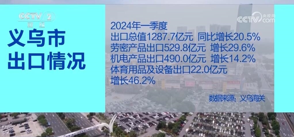 數(shù)據(jù)顯示,2024年一季度,義烏市出口總值達(dá)1287.7億元,同比增長20.5%。其中,勞密產(chǎn)品出口529.8億元,增長29.6%;機(jī)電產(chǎn)品出口490.0億元,增長14.2%;而體育用品及設(shè)備出口達(dá)到22.0億元,增長46.2%。業(yè)內(nèi)人士表示,巴黎奧運(yùn)會(huì)即將召開,以及外商圣誕采購季開始,歐美市場補(bǔ)庫存需求增加,使得相關(guān)產(chǎn)品出口占比顯著提升。