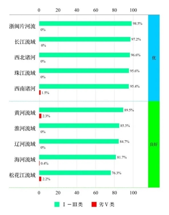 1—3月,長江、黃河、珠江、松花江、淮河、海河、遼河等七大流域及西北諸河、西南諸河和浙閩片河流水質優(yōu)良(Ⅰ—Ⅲ類)斷面比例為91.5%,同比上升1.2個百分點;劣Ⅴ類斷面比例為0.5%,同比上升0.1個百分點。主要污染指標為化學需氧量、高錳酸鹽指數和氨氮。其中,長江流域、珠江流域、浙閩片河流、西北諸河和西南諸河水質為優(yōu);黃河流域、松花江流域、淮河流域、海河流域和遼河流域水質良好。