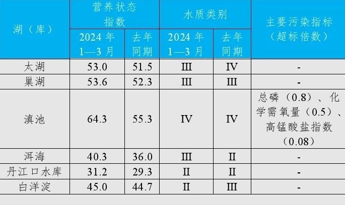 1—3月,監(jiān)測的201個重點湖(庫)中,水質優(yōu)良(Ⅰ—Ⅲ類)湖庫個數占比82.1%,同比上升1.1個百分點;劣Ⅴ類水質湖庫個數占比4.5%,同比下降0.1個百分點。主要污染指標為總磷、化學需氧量和高錳酸鹽指數。181個監(jiān)測營養(yǎng)狀態(tài)的湖(庫)中,中度富營養(yǎng)的9個,占5.0%;輕度富營養(yǎng)的31個,占17.1%;其余湖(庫)為中營養(yǎng)或貧營養(yǎng)狀態(tài)。其中,太湖和巢湖水質均為良好、輕度富營養(yǎng);滇池為輕度污染、中度富營養(yǎng),主要污染指標為總磷、化學需氧量和高錳酸鹽指數;洱海水質良好、中營養(yǎng);丹江口水庫和白洋淀水質均為優(yōu)、中營養(yǎng)。