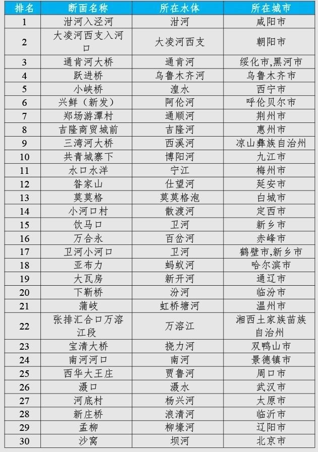 咸陽市泔河入涇河、朝陽市大凌河西支入河口和綏化市/黑河市通肯河大橋等30個國家地表水考核斷面水環(huán)境質量變化情況相對較好(從第1名至第30名),渭南市裕西、天津市新老米店閘和玉溪市化念水庫等30個國家地表水考核斷面水環(huán)境質量變化情況相對較差(從倒數第1名至倒數第30名)。